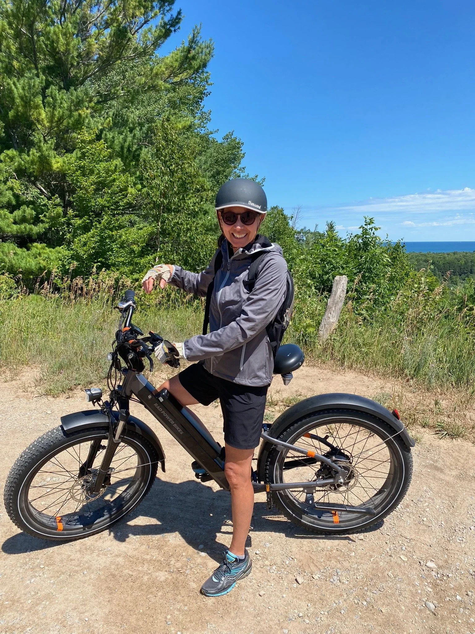 Laura loves riding with small groups and showing them the wonderful trails, backroads, vistas, hidden gems, and varying landscapes in and around the Sleeping Bear Dunes National Park. She wants to expose others to the benefits and joys of riding with pedal assist and explore the rolling hilly countryside of northern Michigan. Laura loves being outdoors and moving through the air, whether on bike, boat, trail, or pickleball court, and hopes to encourage others to get out for some fresh air and exercise.